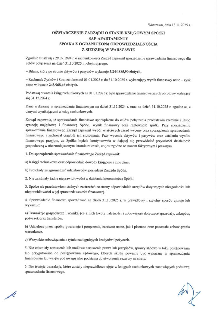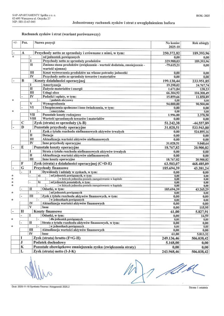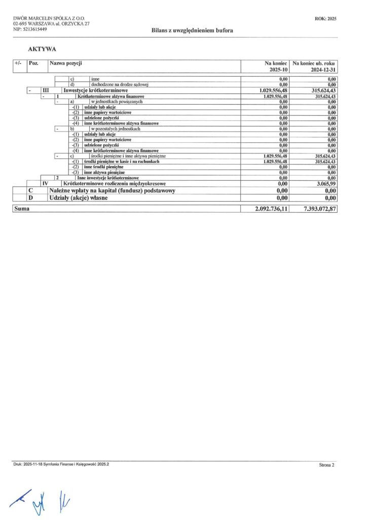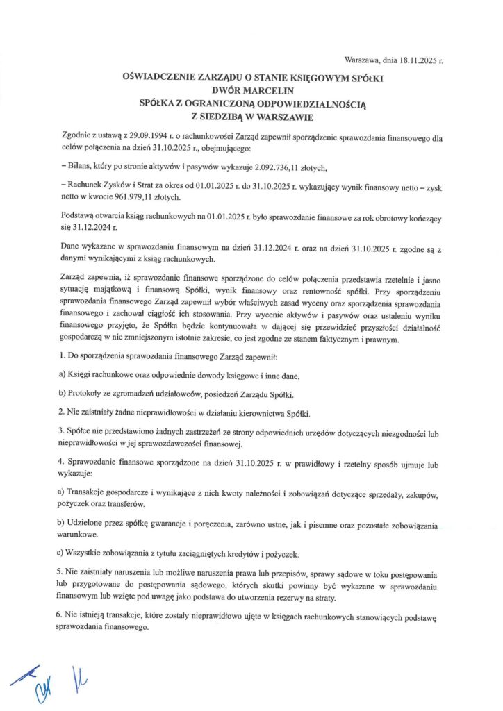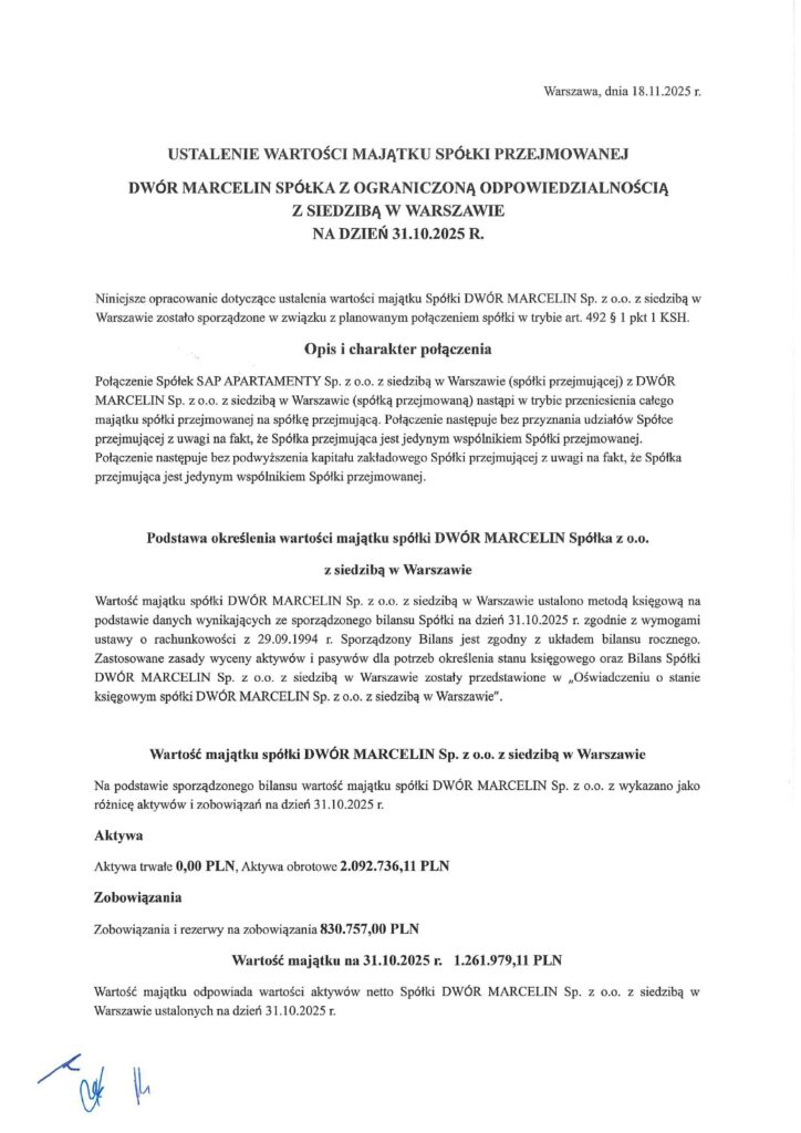 DOKUMENTY FINANSOWEDokumenty finansowe DWÓR MARCELIN Sp. z o.o. za 2024 rok oraz 1-3 kwartał 2025 roku. Dokumenty finansowe SAP-APARTAMENTY Sp. z o.o. za 2024 rok oraz 1-3 kwartał 2025 roku.